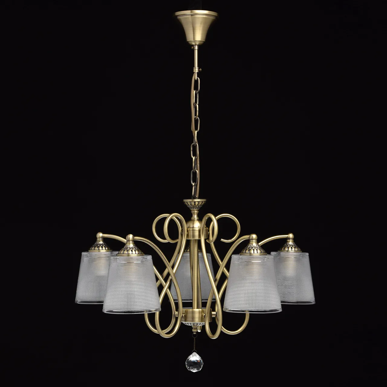Металлическое основание цвета античной бронзы. Плафоны - стекло. Декор - хрусталь.
